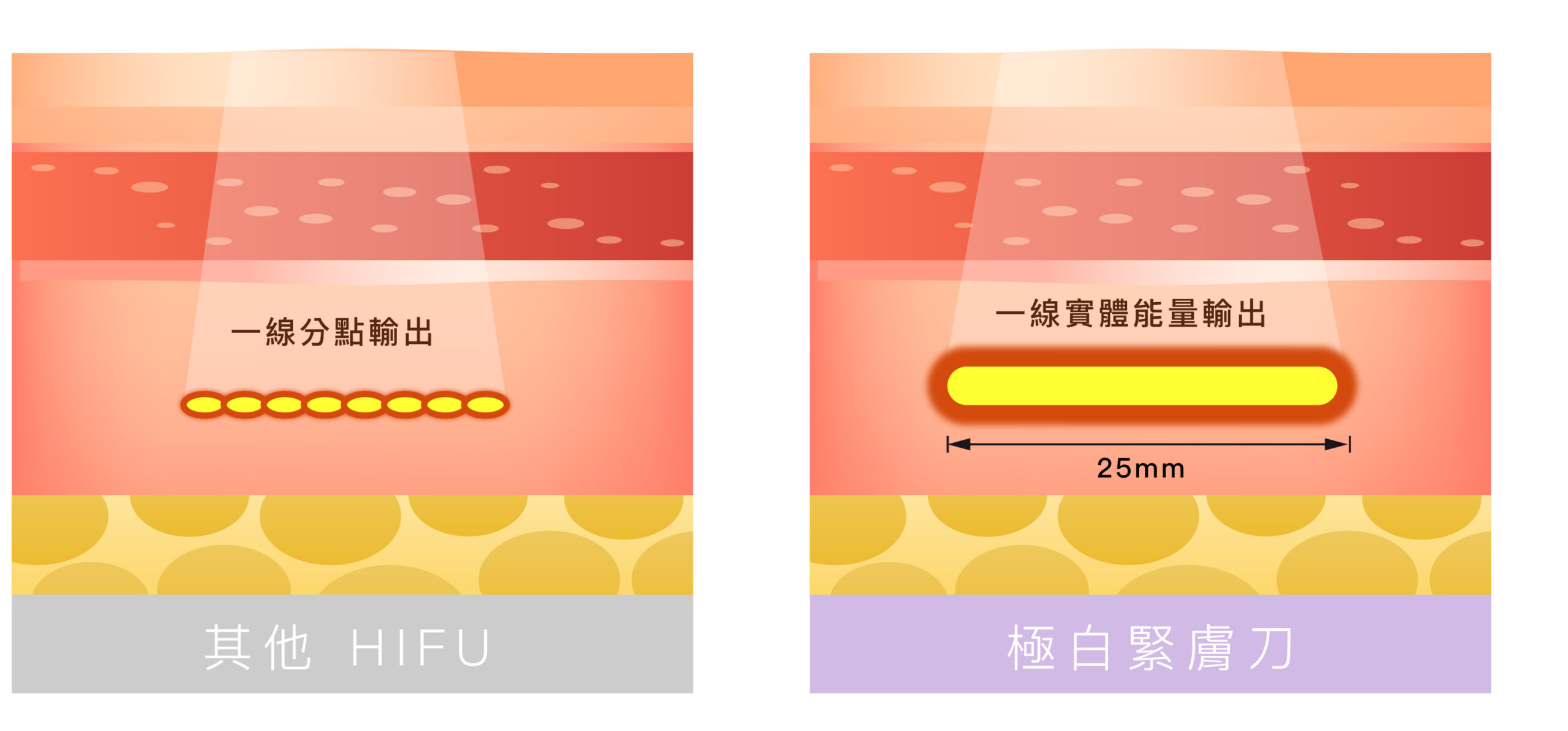 【逆齡緊膚刀】以線陣形式輸出,一線一線把能量傳達至肌膚底層。全效逆齡喚白,刺激表層細胞活躍,加速血液循環,擊散色素。特設治療頭,做到 神速、準確、無痛!有別於以往接觸的「高能聚焦超聲波」以數點形式輸出,點與點之間距離會使組織出現刺激不平均情況,亦造成較多痛感出現。
