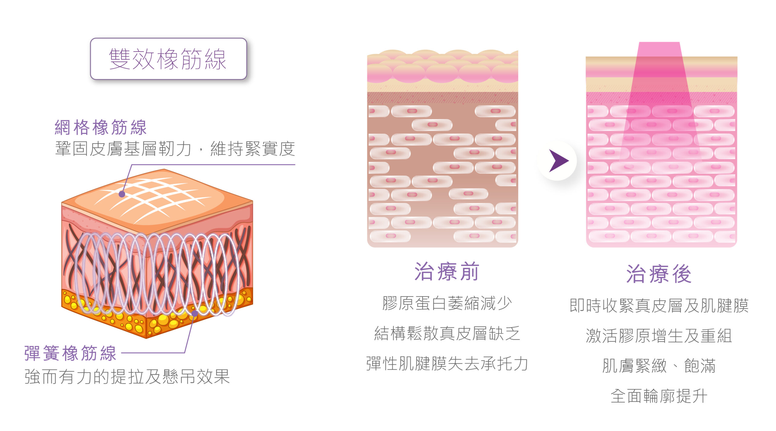 最新醫療級聚焦超聲波,以專利 TDT™熱點擴散技術令蛋白組織受熱產生 「變性作用」形成熱凝點, 造成隱形能量線, 同時讓皮膚底層積聚熱力,刺激膠原增生及重組,為皮膚建立返引力作用的膠原纖維膜,形成具提拉、修正並具彈性的支架,無懼皺紋、鬆弛下垂、贅肉等問題。