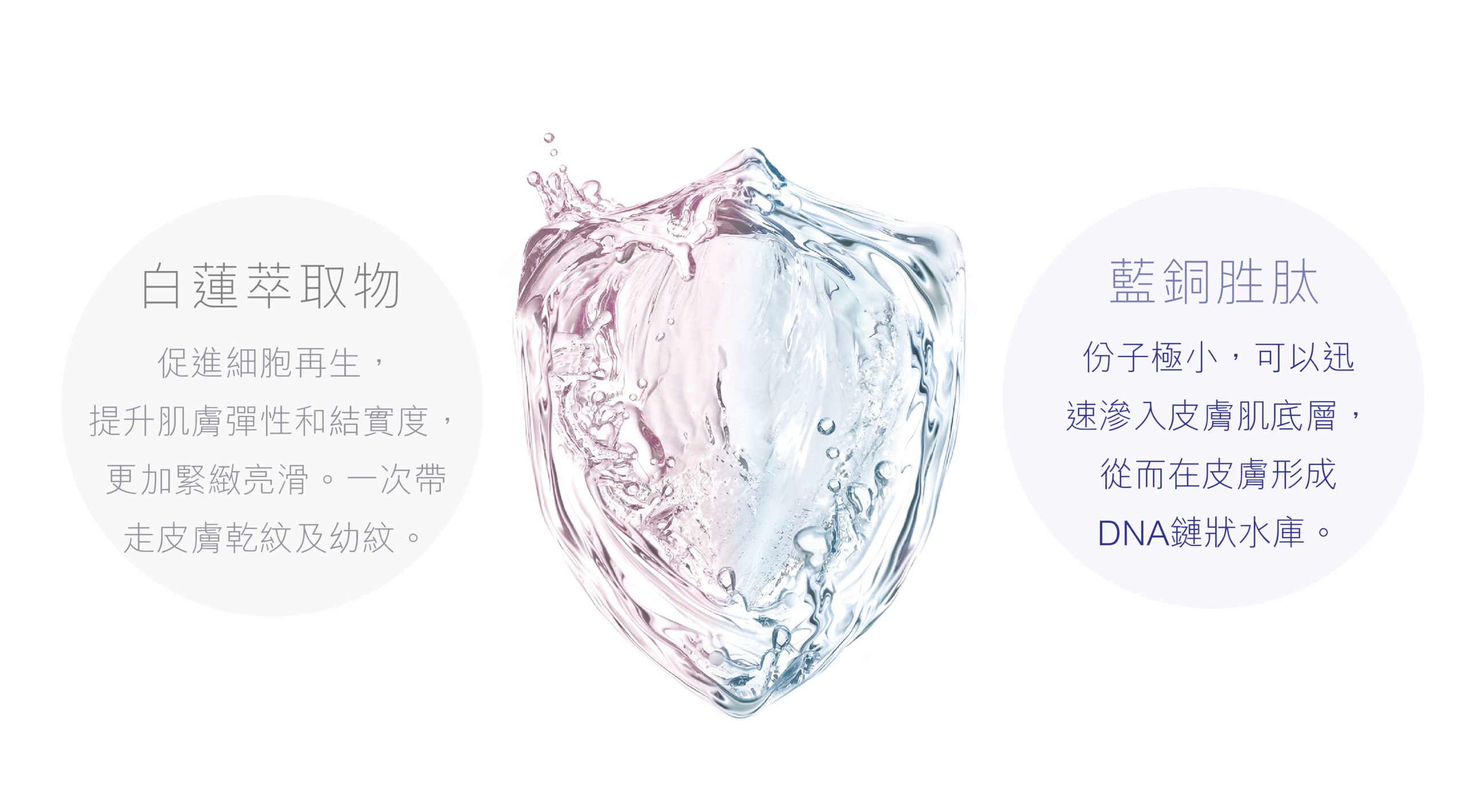 多種皮膚修復及抗衰老的重要元素組合而成。超微份子直透肌底層建立「 DNA 鏈狀水庫 」,建構皮膚天然水膜屏障,促進皮膚細胞癒合和抗炎作用, 提升肌膚彈性和緊緻度。有效刺激皮膚成纖維細胞的膠原蛋白和粘多醣的合成;有助加速皮膚自癒能力。