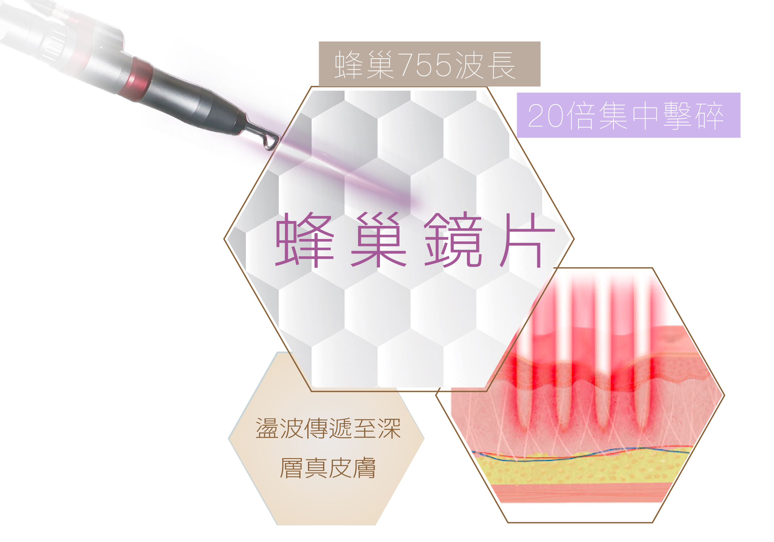 蜂巢755波長,20倍集中擊碎,755波長搭配蜂巢瞬效智慧型治療頭將70%雷射能量匯集聚焦深入色素區,生機械震波強度,將色斑擊退成粉塵狀,瞬間擊碎任何色斑。